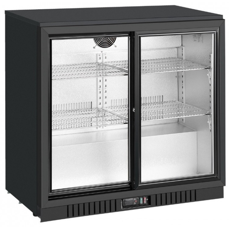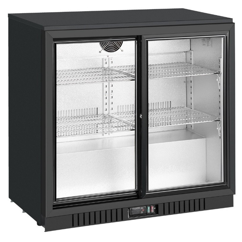 Kühler mit selbstschließender Glastür, dynamische Kühlung, digitale Steuerung. Die Kühlbox ist mit einem Schloss ausgestattet und kann mit 2 Stellfüßen nivelliert werden. Zur Beleuchtung der Produkte im Inneren des Kühlers wird eine LED-Beleuchtung eingesetzt. In der Kühlbox befinden sich zwei bewegliche weiße Drahtböden.
