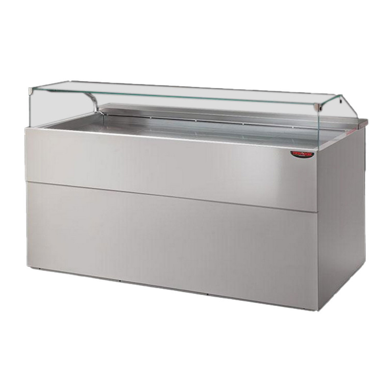 Comptoir réfrigéré avec vitres droite à l'avant et angle de 45 degrés à l'arrière en verre trempé. Conçu pour la présentation de pâtisserie, macarons, charcuteries, produits laitiers, fruits.