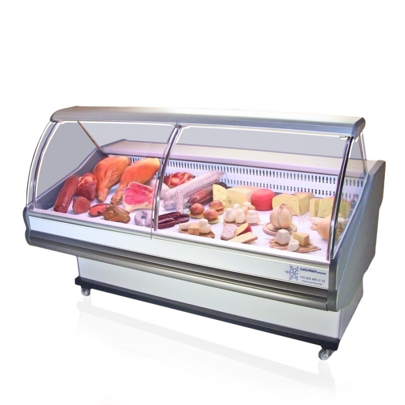 Comptoir réfrigéré, ventilé pour la présentation de viandes, charcuteries, crèmerie et plats préparés. Vitres frontales bombées relevables. Éclairage de l'étalage. Réserve réfrigérée avec portes. Dégivrage automatique et programmable.